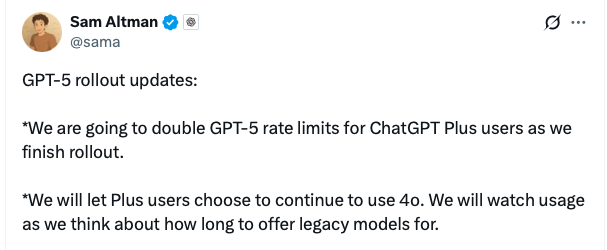 上周五,奥特曼在X上宣布,公司将继续为ChatGPT Plus用户保留旧版模型,并承诺会改善GPT-5的性能和用户体验。奥特曼还承诺,将提高GPT-5在ChatGPT Plus用户端的速率限制(rate limit),并表示: